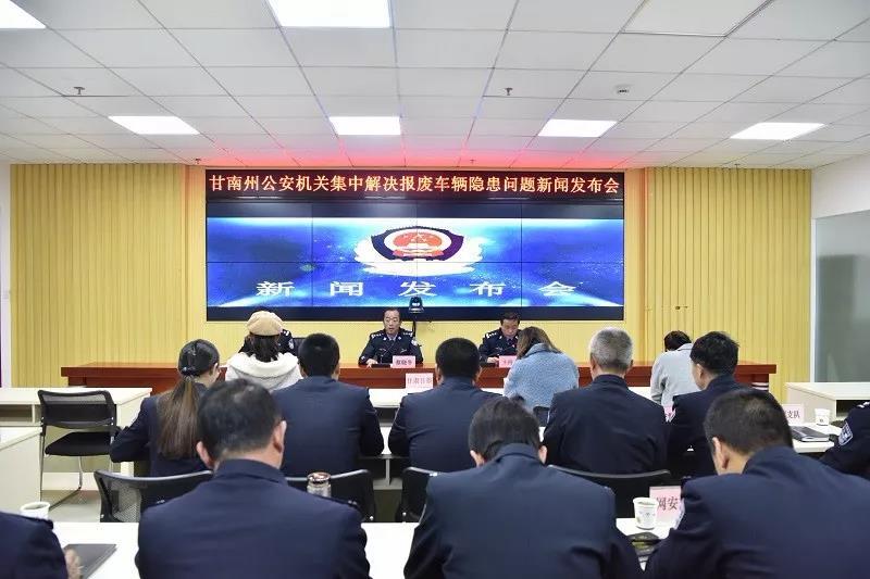 11月19日下午,甘南州公安局召开全州公安机关集中解决报废车辆隐患问题新闻发布会,局党委委员、副局长蔡晓冬就工作开展情况及取得的成果进行了发布,交警支队副支队长雷宏图主持发布会,甘肃日报驻甘南记者站、甘南电视台、甘南日报、中国甘南网等媒体出席发布会,州局政治部、督察、治安、经侦、刑侦、指挥中心、法制、网安等部门负责人和交警支队领导班子成员、车管所所长及业务主办民警参加发布会。